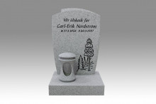 E006 - Stenen är helt mattslipad med fasade kanter. Texten och dekor är försänkta och svartmålade. På den extra djupa socken står en lykta i granit. Ljusgrå granit. |