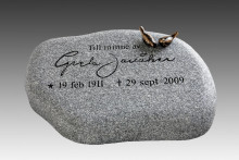 E048 - En sluttande natursten. Hela stenen är flammad och texten är djupblästrad med stenglans. Dekor: bronssparvar. Mörkgrå granit. |