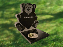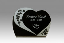 E065 - Liggande hjärta i svart granit. Polerad/finhuggen framsida och polerade sidytor. Text och dekor i mitten är försänkt och efterhuggen. De båda yttre dekorerna är upphöjda. |
