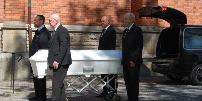 Inget får gå fel när kistan ska bäras in till koret i kyrkan. Kjell Wendel och Herbert Gaugl med kollegor kan inte tänka sig ett finare uppdrag.